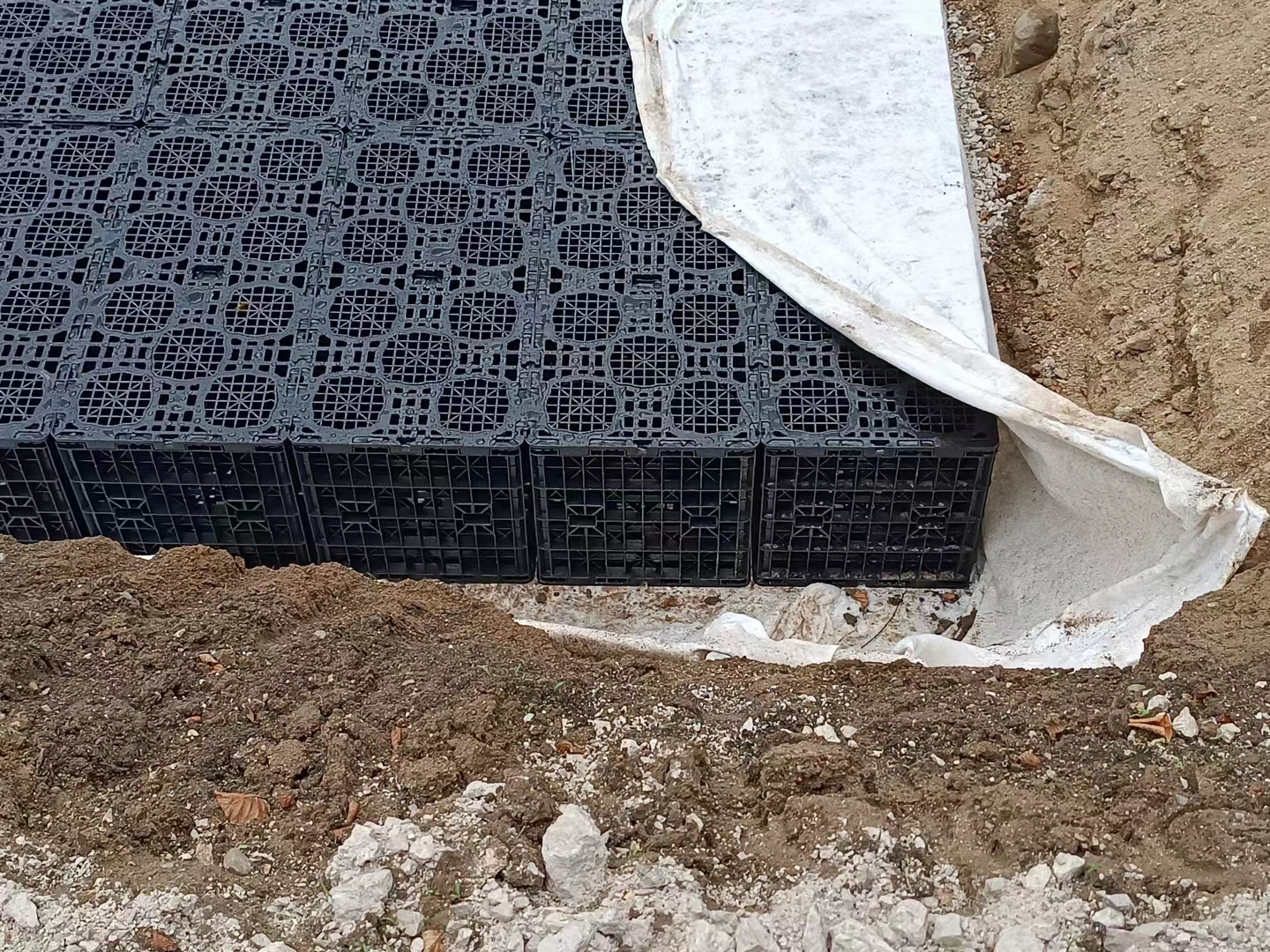 Surface water slowly returns to the soil after flowing into the geocellular tank, reducing pressure on the drainage system.